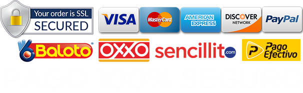 Aceptamos tarjeta de crédito, debito y pago en efectivo si te encuentras en México con Oxxo y en Colombia con Baloto